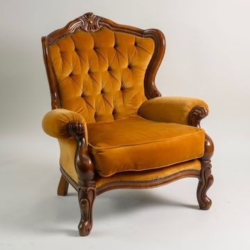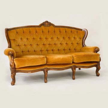 Our mustard yellow velvet baroque-style three-seater sofa and matching armchairs, with their plush tufted backs and ornate wooden frames, add a bold pop of colour and vintage charm to weddings, photo shoots, lounges or cocktail parties