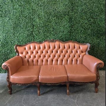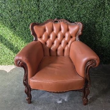 Our light brown leather baroque-style lounge set, featuring a grand three-seater sofa and matching armchairs with intricate wood carvings and tufted detailing, makes the perfect statement piece for weddings, photo shoots, corporate events or a luxe party lounge area